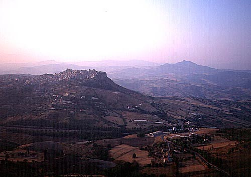 エンナとカラシベッタ。大海原にうかぶ2つの小島のようだ。 だが、こちらから見るとあちらの島は、頂がつぶれているようで ちょっとぶざまだ。 そのつぶれたところに、集落がへばりついている。